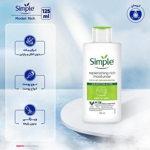 کرم آبرسان سیمپل مدل Rich با حجم 125 میلیلیتر، یک محصول مراقبت از پوست است که برای هر دو جنس بانوان و آقایان طراحی شده است. این کرم با ویژگیهای سازگاری با محیط زیست، از جمله عدم تست بر روی حیوانات، انتخابی اخلاقی و مسئولانه است. ترکیبات کرم شامل ویتامین های E و B5 است که به تغذیه و ترمیم پوست کمک میکنند، در حالی که فاقد الکل، پارابن و مواد شیمیایی سخت است. بنابراین برای انواع پوست، حتی پوستهای حساس، مناسب است. بافت سبک و قابلیت جذب بالای این کرم، آن را به یک مرطوب کننده عالی تبدیل میکند که پوست را نرم و لطیف میسازد و تا 12 ساعت آبرسانی میکند. کرم آبرسان سیمپل مدل Rich، که در هلند تولید شده و دارای مجوز از سازمان غذا و دارو است، اطمینان از کیفیت و ایمنی را به همراه دارد. جنس محفظه پلاستیکی و نوع محفظه تیوپی، استفاده از آن را آسان و بهداشتی میسازد. این کرم، با تأکید بر مراقبت ملایم و مؤثر، گزینه ای عالی برای مراقبت روزانه از پوست است.